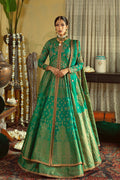 Front open shirt with fine handcrafted zardozi work on front and back bodice and sleeves embellished ban neck design with jamawar lehenga. Jacquard dupatta with two sides weaved border.
