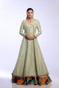 Pairing perfectly with the angrakha is a mint green raw silk gharara, showcasing a delightful multi-silk block apleak pattern. The gharara is meticulously finished with gotta and multi-chata pati, creating a truly eye-catching and traditional look.