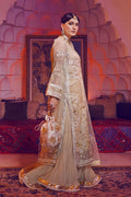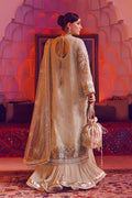 A beautiful shade of ivory long shirt is rendered in tulle and deftly adorned with glowing gold tilla, gotta, dabka and pearls as ˜Jeevri'. Paired with luxuriously embellished tulle dupatta and pure raw silk pants, this absolutely ethereal and incandescent ensemble is an exquisite addition to your formals wardrobe or trousseau.