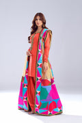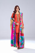 A short shirt featuring a cascading embellishment extending from the neckline to the midsection of the shirt with fitted  sleeve hem. The tissue dupatta is a captivating accessory adorned with a border embellished with multicolored patches and delicately hanging embellishments that add an extra touch of charm and elegance to the overall design.