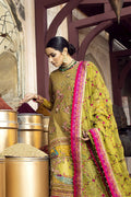 A green heavily machine embroidered and hand embellished shirt paired with a hot pink bordered gharara crafted with pink florals. This ensemble is completed by a net dupatta having machine embroided florals.