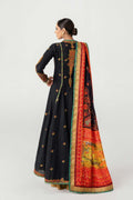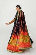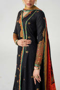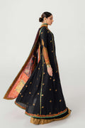 The angrakha style adorned with embroidery and a green and orange embroidered border all around and cuffs.The outfit includes a vibrant dupatta with a multicolored print on silk, with a gold banarsi border and green embroidered boarders. The sharara pants are finished with gold banarsi border at the hem. This ensemble looks perfect for festive occasions.