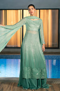 A gracefully designed chiffon shirt and dupatta, beautifully ombre-dyed for an ethereal touch. The shirt features intricate sequin and silk thread embroidery, enhanced by high slits for a statement look. Paired with a ten-panel raw silk sharara, this ensemble exudes elegance and timeless charm.