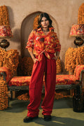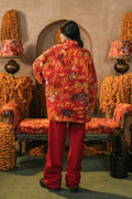 This statement button-down shirt features a bold red base adorned with an intricate digital print, depicting dynamic battle scenes and regal motifs. Crafted from lightweight premium fabric, it offers a structured yet comfortable fit. The classic collar and full-length sleeves add a refined touch, making it a versatile piece that effortlessly blends heritage-inspired artistry with contemporary fashion.