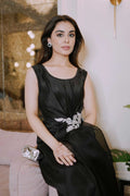 Asymmetrical draped dress with chunky crystal and zardozi embroidery motifs. It is paired with a plain organza dupatta with a silk finish and silk boot-cut pants.