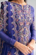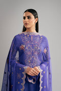A stylish A-line shirt featuring a gently flared silhouette, adorned with intricate detailing around the neckline and biceps, complemented by a four-sided scalloped dupatta.