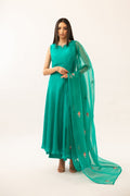 A captivating asymmetrical teal dress, expertly draped with a subtle side slit, harmoniously coordinated with pure raw silk azar pants. Enhance the ensemble with a pure organza dupatta beautifully adorned with fish-shaped motifs.