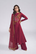 Immerse yourself in the luxurious drape of our wine-colored silk masterpiece. Six panels cascade down the front and back, each a whisper of elegance, adorned with delicate floral embroidery and shimmering zardozi details. Pure silk culottes dance in perfect harmony, and an embroidered net dupatta completes the symphony of opulence. This is more than an outfit; it's a declaration of your discerning taste, a timeless treasure fit for a queen.
