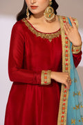 This opulent crimson color anarkali showcases a lavishly adorned neckline and intricate wrist border embroidery. It is expertly paired with graceful bell-bottom pants and an exquisitely embroidered shawl featuring captivating scenes of nature, including birds and stunning landscapes. This ensemble epitomizes luxury and extravagance in every detail.