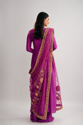 An elegant, long paneled shirt showcasing cascading embroidery that flows from the neckline to the midsection, complemented by decorative applique patches at the sleeve hems. It is paired with a net dupatta adorned with delicate antique-style machine-embroidered sequin motifs.