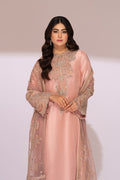 Experience sheer luxury with this exquisite ensemble in a delicate shade of light pink. The a-line shirt, crafted from luxurious raw silk, is expertly paired with qulote pants and a sumptuous embroidered net dupatta, tastefully finished with a resplendent gold tissue border. The sleeves and neckline are a masterpiece, adorned with opulent naqshi dabka work, lustrous pearls, and dazzling diamontis. This ensemble exudes elegance and extravagance, making a bold statement of opulence and sophistication.