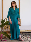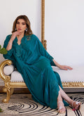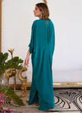 Step into the limelight in this absolutely striking emerald kaftan that is truly the most sought-after silhouette of the season. The breathable crepe allows you to carry this style with ease letting it shape your body in the most flattering manner. The scallop cut-work neckline and sleeves are meticulously worked with hand embellishment and stone detailing that carries all way the way to the slits and the hem, adding a gorgeous symmetry and grace to the entire outfit. This statement piece with its flawless tailoring will have you looking like a true sight to behold on any given occasion.
