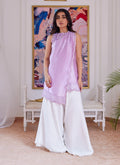 Suzette is an asymmetric short wrap gives classic glam a fresh new look by combining this gorgeous subtle lavender shade with one of them most unique silhouettes for this spring. The shisha silk shirt is beautifully worked with embroidered scallops and donned with 3d flowers, hand embellished detailing and an intricate organza border at the hem. It can be paired with these one-of-a-kind voluminous loose crepe pants with lace detailing that uplift the entire silhouette by adding length and making this entire vibe cool and composed in the most fun spring way.