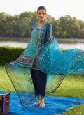 Turn up the glamour with this striking ink blue and teal ensemble - a seamless blend of tradition and contemporary allure. Cut from pure raw silk, the silhouette is designed to flatter effortlessly, featuring a thigh-skimming wrap top that cinches loosely at the waist for a beautifully feminine shape. Intricately hand-embellished with sequins, gota, and aari work, this piece radiates festive opulence. The tapered pure raw silk shalwar balances the drama with refined sophistication, making it an eternal favorite for every celebration.