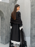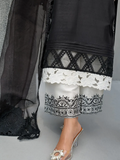 Experience elegance with our black raw silk kurta. It boasts intricate arih work on the neckline and sleeves, complemented by lace finishing on the sleeves and sides. The damaan features beautiful embroidery and lace finishing. Complete your look with a lace applique organza dupatta and a white izhaar with black embroidery details.