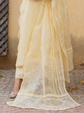 This breezy yellow kurta is perfect for summers with intricate embroidery and flower details embellished with pearls, diamonte and sequins, paired with yellow boot cut pants. Dupata has embroidery details, pleats and lace details can be dressed up or down according to the occasion.