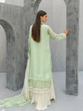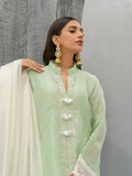 Indulge in sophistication with our green organza kurta. It boasts delicate embroidery and mirror work, complemented by organza and lace finishing on the damaan and sleeves. Paired with a shaded green and white silk dupatta, this ensemble offers a graceful and refined look