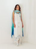 White raw silk kurta featuring cut work and delicate embroidery details on the damaan, complemented by exquisite applique work on the neckline. Paired with a shaded dupatta and flair pants adorned with embroidered motifs, this ensemble exudes timeless elegance and charm, comes with sleeve attachments.