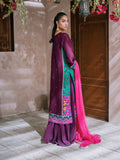 Plum shirt with screen print on the chaak and gorgeous handwork details on the neckline, damaan, sleeves, and chaak, paired with a net dupatta and flared pants. Made from pure raw silk for the kurta and pure crepe silk for the pants.
