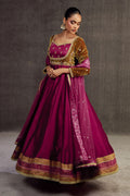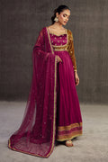 This luxurious article features a crimson colored pishwaas with a mustard green colored bodice which has carefully placed embellished all finished with a block printed daman and an embellished crimson red net dupatta.