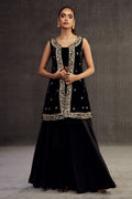 This amazing article features a fully embroidered and embellished black velvet coat with a velvet tube top and silk izaar pants.