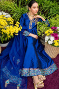 A bold ink blue silk pishwas is rendered in glowing tilla, dabka and resham work with contrasting blocked hemline. Can be paired with a screenprinted organza dupatta for an ethereal and incandescent ensemble that makes for an effortless formal look.