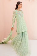 This elegant ensemble turns a timeless piece into a royal fantasy. With hues of Gold and pastel resham embroidery with Hand embellishments, can be paired with trendy ruffled gharara.