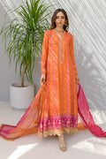 A three piece kalidaar pishwas in tangerine color using a richly khaadi embroidered neckline , featuring embellished handwork with blockprinted hem line and glistening embellishment laces.