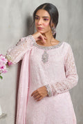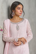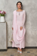 Baby pink embroidered chikan shirt on pure chiffon, intricate aari embroidery on neckline, and sleeves. It can be paired with silk embroidered pants and a wrap-around chiffon embellished dupatta.