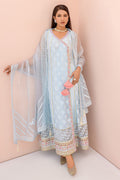 An angharka-styled pishwas in ice blue color on the pure self-banarsi khadi net with a block printed front, sleeves, and hemline heavily, adorned with beautiful tassels hemmed with embroidered borders. It can be paired with an embroidered organza dupatta and cotton silk pants