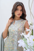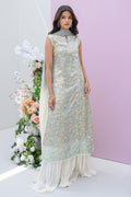 This modern article features a sage green printed silk angrakha style paneled shirt. The neckline is intricately embroidered and framed with delicate lace border detailing. The printed daaman adds an elegant touch to the design. The ensemble is paired with a crushed cotton silk bottom and completed with shaded cotton silk dupatta, creating a refined and graceful look.