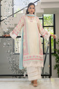 This beautiful article features an ivory, sage, powder pink and pastel purple printed silk shirt with an embroidered and embellished neckline and a scallop embroidered sleeves and daaman details all finished with white lace details culottes and a cotton silk ombre dupatta.