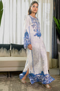 This modern article features a white and blue printed floor length kaftan with long flared sleeves and an embroidered and embellished neckline and sleeves all finished with pearl details.