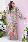 Wildflower - where effortless grace blooms in every detail. This modern article features a digital printed foot length kaftan-shirt with printed borders and a neckline adorned with fabric beads in complimentry colors.