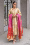 A regal gold kameez infused with traditional charm, enhanced by resham embroidery and subtle floral motifs. Paired with a vibrant magenta and burnt orange dupatta featuring traditional bandhani-inspired patterns, the contrast brings warmth and grandeur. This ensemble is timeless, versatile, and celebratory-suited for festive gatherings, traditional functions, and elegant wedding festivities.