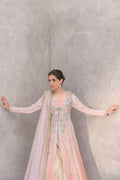 An ethereal pastel peach-pink peshwas crafted on delicate net fabric, adorned with intricate silver embellishments, pearl accents, and fine zari work. The ensemble flows gracefully with a heavily bordered hemline in soft coral tones, perfectly balanced with a sheer dupatta edged in antique gold. Regal yet romantic, this look is ideal for day weddings and receptions, radiating timeless elegance.