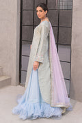 A dreamy powder blue long kameez adorned with delicate pastel embroidery and crystal embellishments, paired with a lilac net dupatta. The outfit is finished with soft ruffled organza edging at the hem, adding movement and charm. Light, ethereal, and graceful, this ensemble is an enchanting choice for day weddings, engagement ceremonies, or elegant festive affairs.
