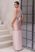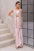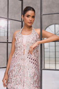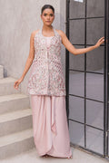 This ensemble presents a contemporary yet graceful take on eastern wear. The halter-style jacket is richly adorned with delicate thread embroidery and sequins, forming floral and lattice-inspired motifs. The pastel palette of soft pinks and silvers lends a dreamyelegance.Paired with sleek draped silk pants, this design strikes a balance between tradition and modernity. Seashell pearl is a refined choice for women who value sophistication with a touch of individuality.