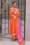 A vibrant burnt orange straight kameez, exquisitely detailed with silver and resham embroidery along the neckline, sleeves, and hemline. The look is elevated with a striking contrast dupatta in fuchsia pink and orange hues, adorned with delicate motifs and finished with a fine green edging. This ensemble is a celebration of festive charm, blending tradition with modern vibrance-perfect for mehndi festivities, dholkis, or day weddings.
