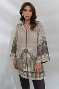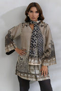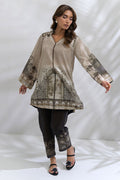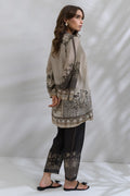 Embrace a sophisticated and grounded look in this breathable Swiss lawn co-ord set. This earthy-toned co-ord features a soft beige and black color pallete. The relaxed straight-cut shirt is paired with tapered pants featuring intricate border detailing and an optional similarly printed silk scarf which makes it perfect for a refined brunch or art gallery stroll.