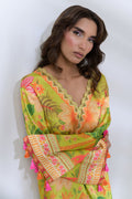 Emrace a tropical style with this elegant breathable shamooz silk kaftan, featuring a parrot green base with orange and pink accents. This is a long ankle-length kaftan with flowy bell sleeves that are finished with tassels which make this outfit perfect for beach days, casual luncheons or a girls day-out