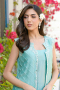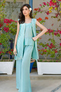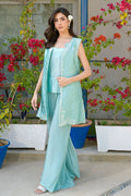 This modern article features a turquoise short front opened pure sheesha silk coat with pintuck details and mirror work embellishments a embroidery all finished with Russian silk flared pants and a pure organza dupatta with pituck details