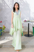 This gorgeous article features a chiffon pistachio colored fully embellished and embroidered high-low peplum paired with Russian silk flared pants and an organza dupatta.