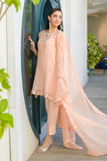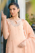 This beautiful article features a peach colored embroidered and embellished khaadi net short shirt with a keyhole neckline and a third-quarter puff sleeve all paired with a cotton silk shalwaar and a khaadi net dupatta with cutwork details.
