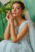 This Blue colored, draped with flair in the net with a heavy hand-embellished bodice, further enhanced with pearl and sequins embellishments is one of a kind outfit, this unique piece comes draped with a net embellished duppatta. It can be paired with straight pants.