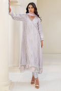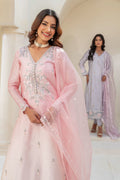 This silver-grey ensemble exudes modern elegance with its three-paneled A-line shirt featuring delicately flattering pearl-embellished side panels. Contrasting floral borders on the hem and sleeves add a romantic touch, while silk pants with intricate lace details complement the ensemble. The look is further elevated by the addition of an organza dupatta adorned with contrasting organza tassels, creating a sophisticated and effortlessly classy aesthetic.