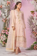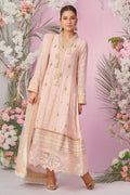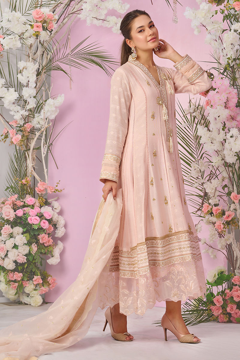 Deena is a luxurious silhouette played along with a pale pink hue embedded with modern embellishments of Lace, pearl, and sequins. A khadi net-based long shirt is ornamented with embroidery motifs. It is paired with an embellished organza dupatta concluded with katdana lace making it a timeless masterpiece.