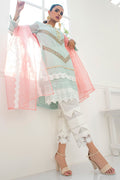Trendy Organza shirt with handwork and blockprinted details comes with our lace pants for elegance.