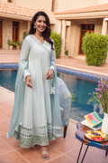 A striking Signature Kalidaar in soft mint hues, complemented by subtle tones of white. The embroidered borders and sleeves, paired with the angrakha cut, bring a touch of elegance, while intricate laces add detailed charm to the ensemble. It's a masterpiece of sophistication and style, combining beauty with intricate craftsmanship