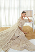The beige gold shirt, crafted from fully embroidered net, features intricate dabka, pearl, and sequin detailing on the front neckline. Paired with a ruffled gharara, it balances elegance with flair. The fully embroidered net dupatta, adorned with dazzling tassels, adds glamour and completes the look. Together, these pieces create a captivating outfit perfect for any special occasion, exuding grace and sophistication.